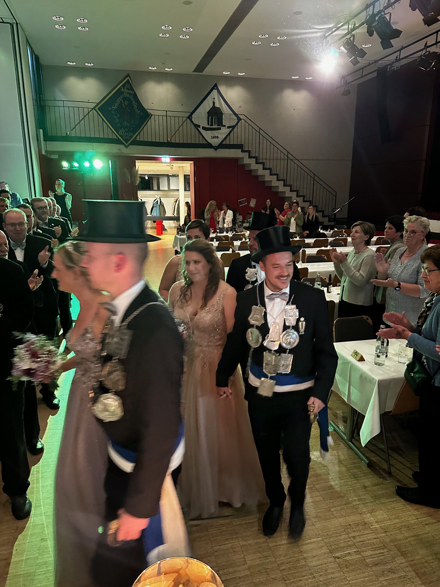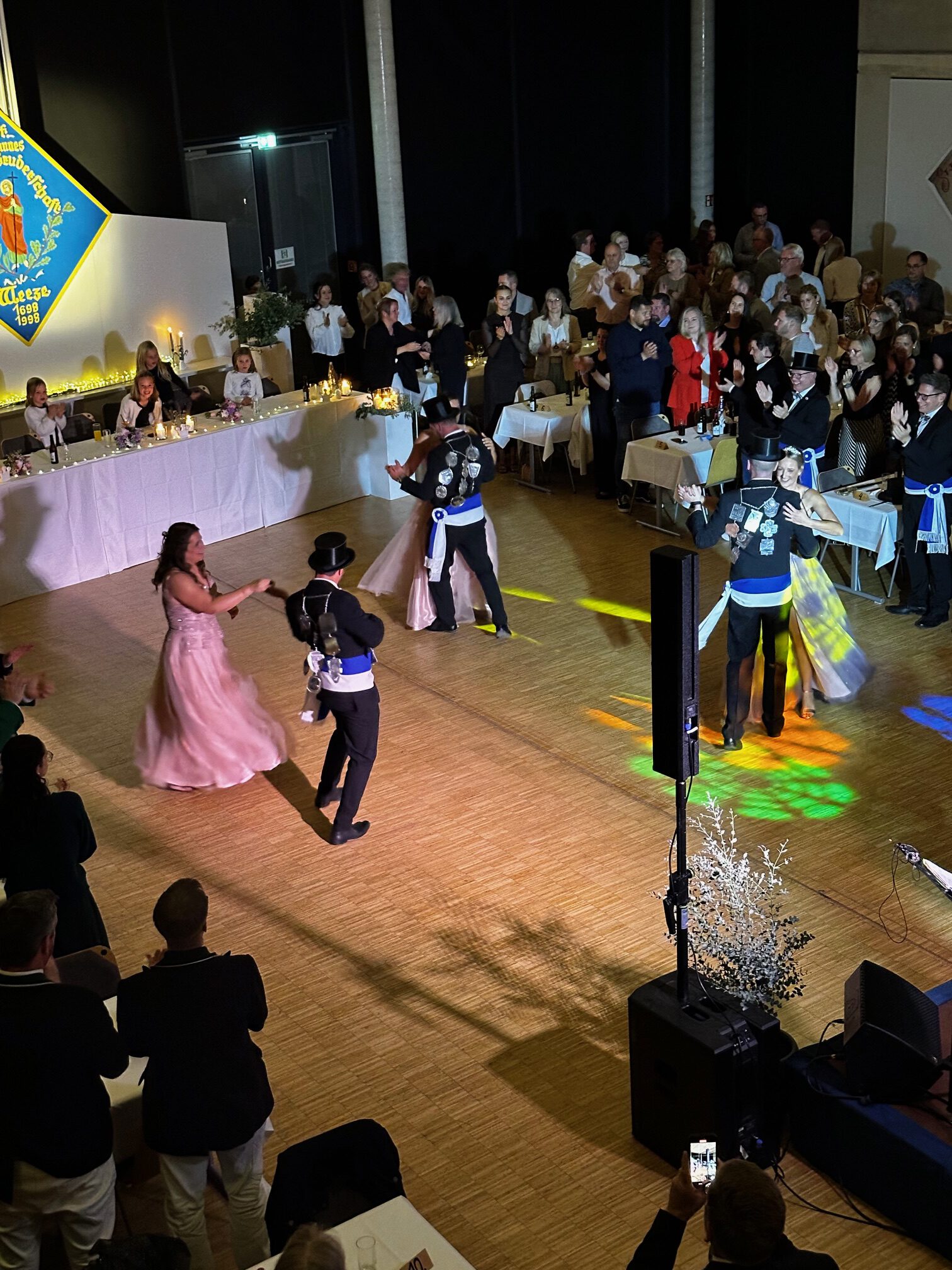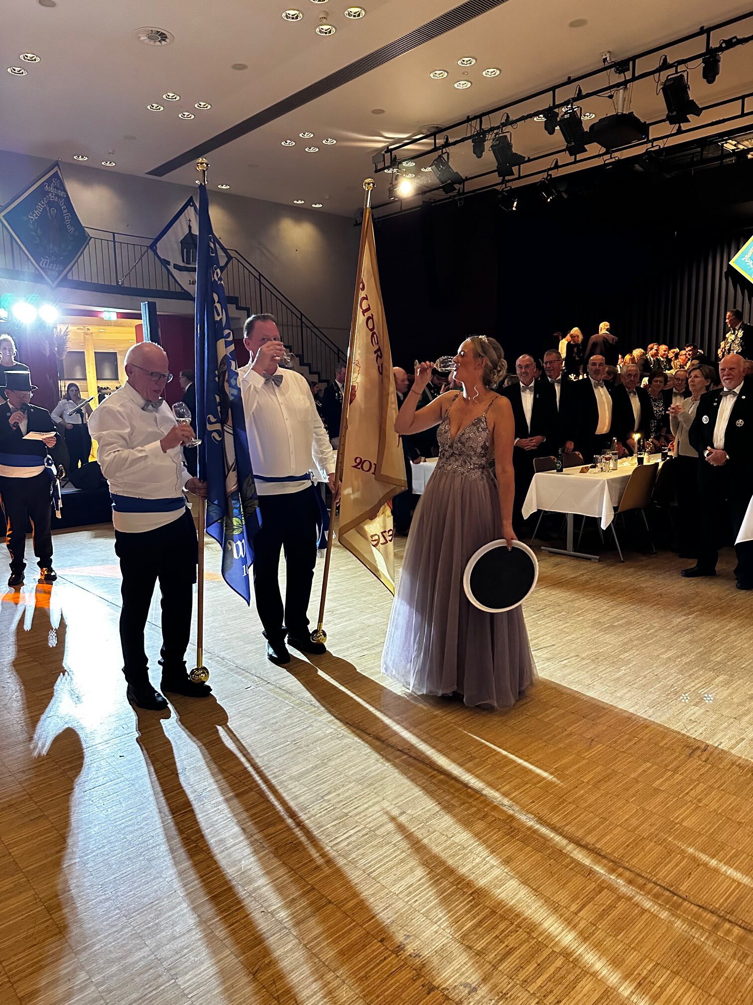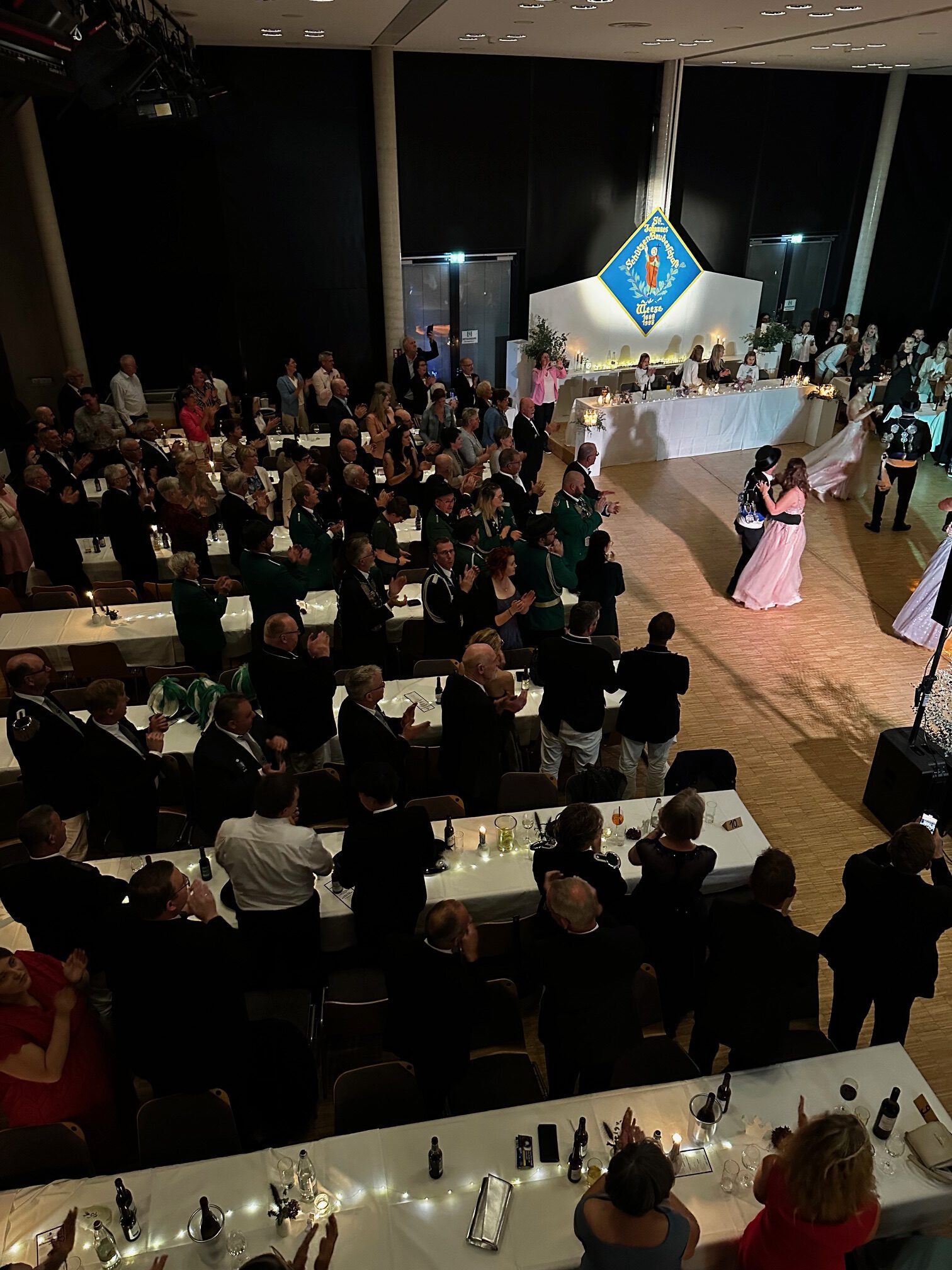 Im Anschluss an die Begrüßung folgte das traditionelle Fahnenschwenken zu Ehren des Throns, vorgetragen durch Norbert Hermens und Uwe Lauff. Nach einer kurzen Ansprache des Königs und den Ehrentänzen konnte der Abend in die Vollen gehen. Bei toller Musik des Duos “Two for You“ wurde viel getanzt und die festliche Gesellschaft vergnügte sich bei guter Unterhaltung bis in die frühen Morgenstunden. Eine schöne Tombola mit hochwertigen und interessanten Preisen rundete den gelungenen Abend ab.