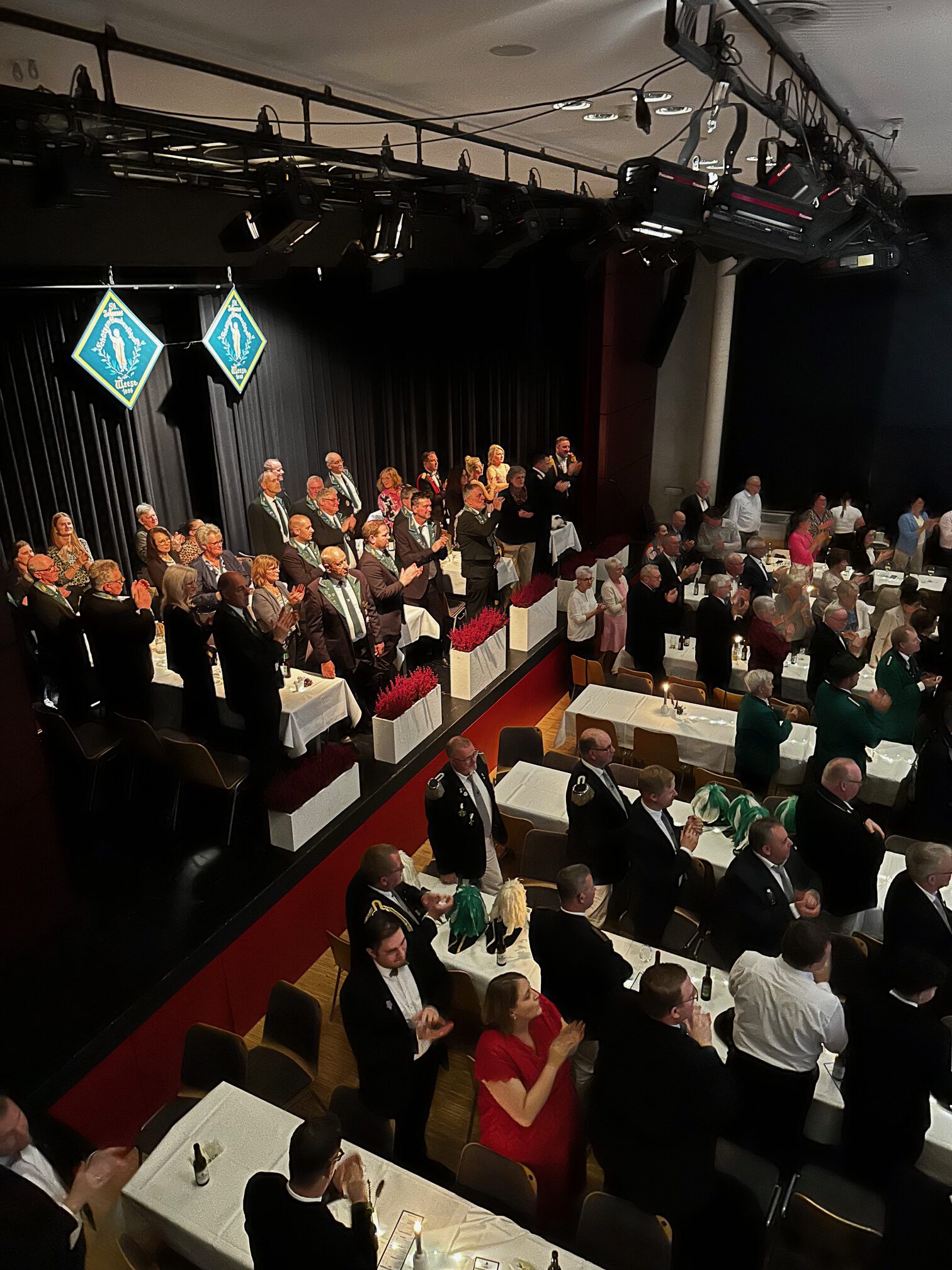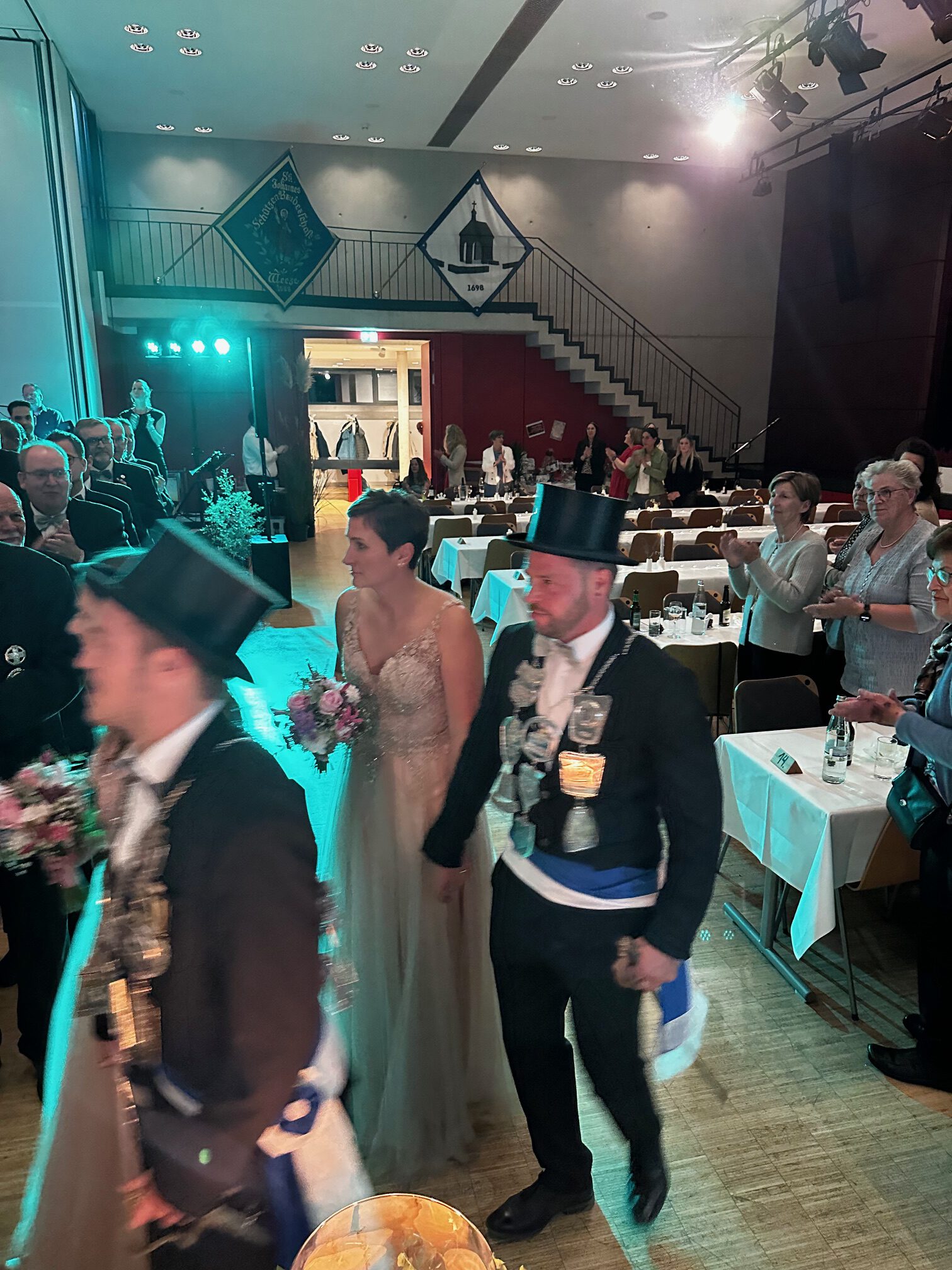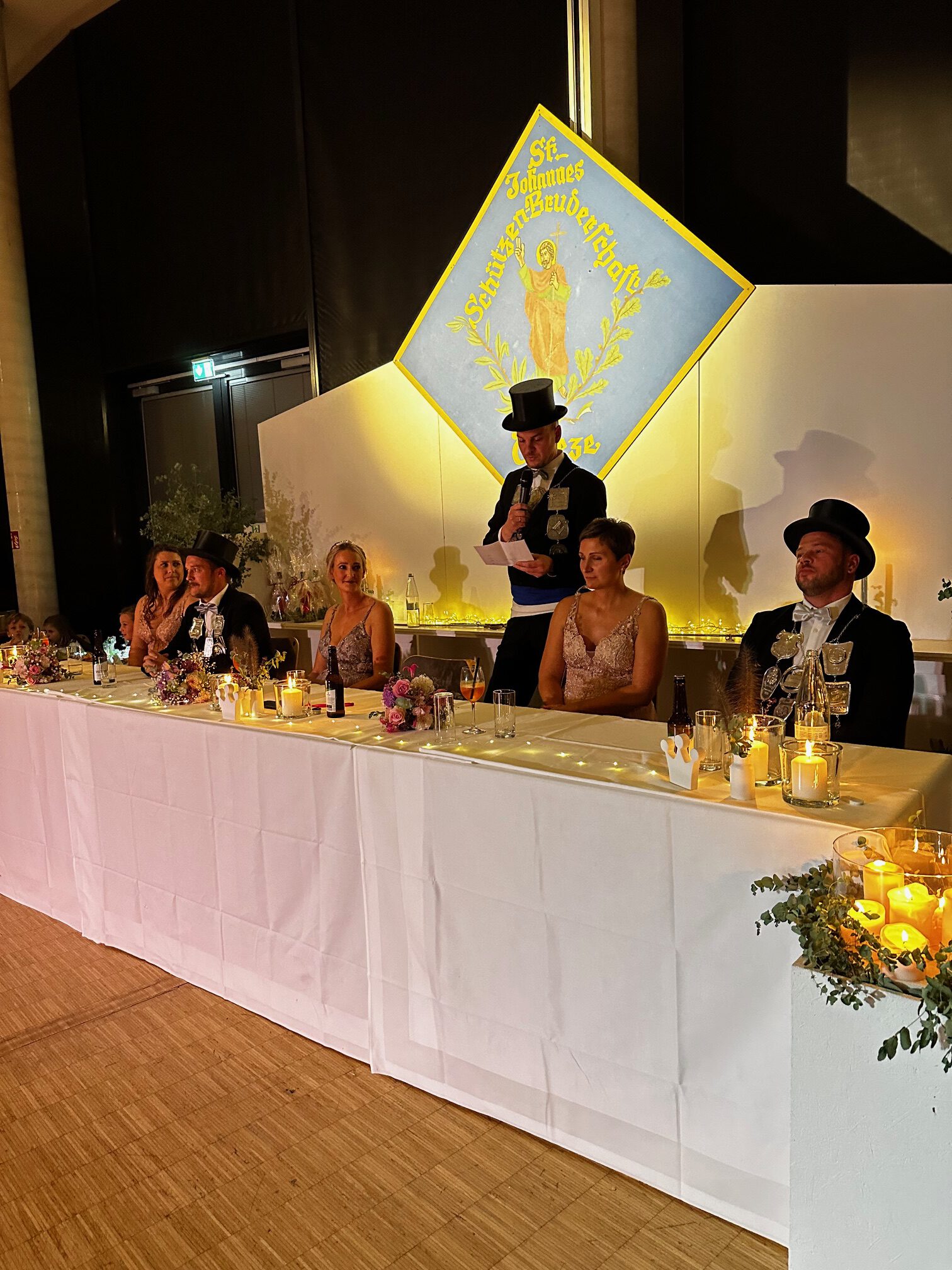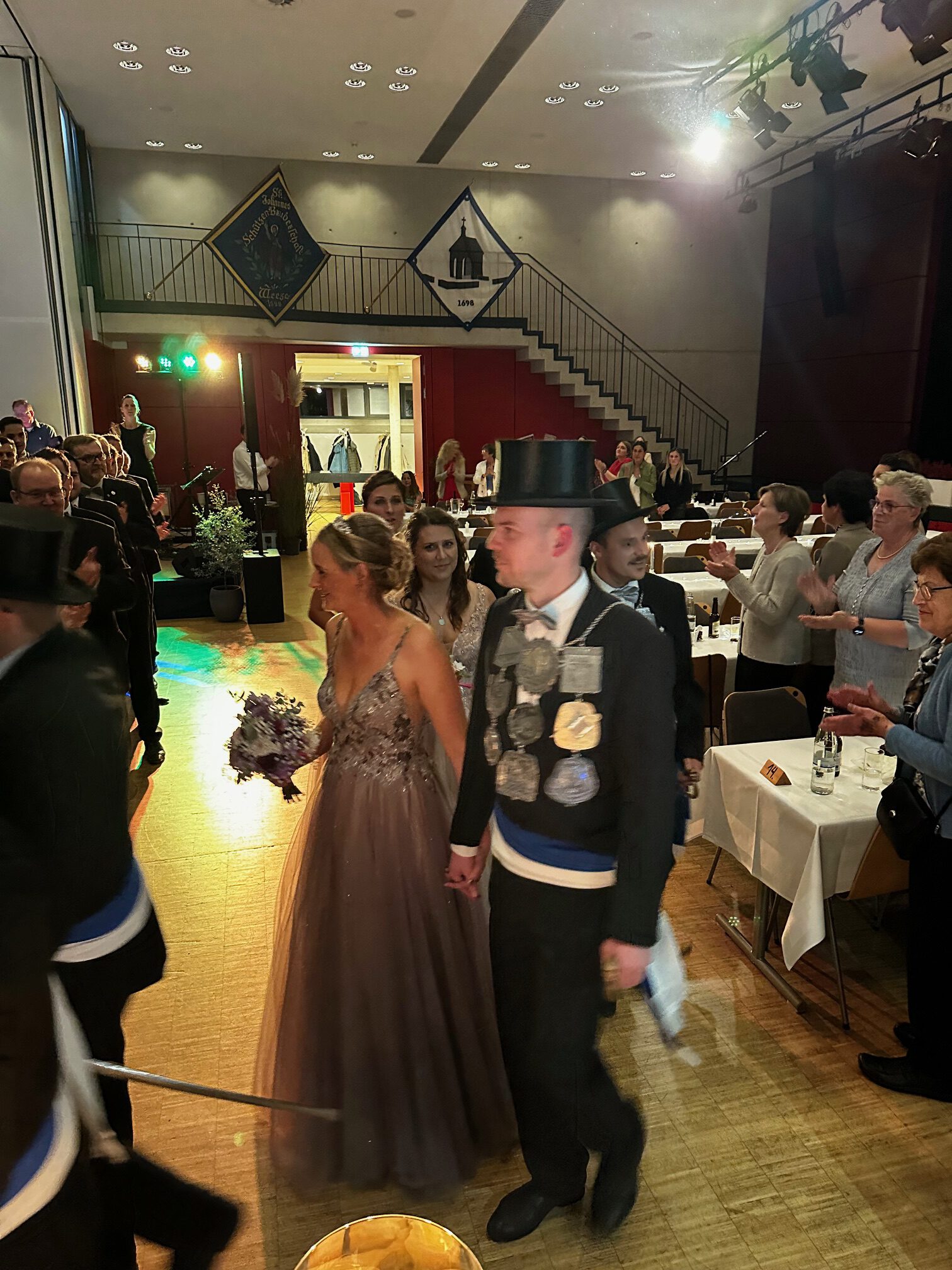 Im Anschluss an die Begrüßung folgte das traditionelle Fahnenschwenken zu Ehren des Throns, vorgetragen durch Norbert Hermens und Uwe Lauff. Nach einer kurzen Ansprache des Königs und den Ehrentänzen konnte der Abend in die Vollen gehen. Bei toller Musik des Duos “Two for You“ wurde viel getanzt und die festliche Gesellschaft vergnügte sich bei guter Unterhaltung bis in die frühen Morgenstunden. Eine schöne Tombola mit hochwertigen und interessanten Preisen rundete den gelungenen Abend ab.