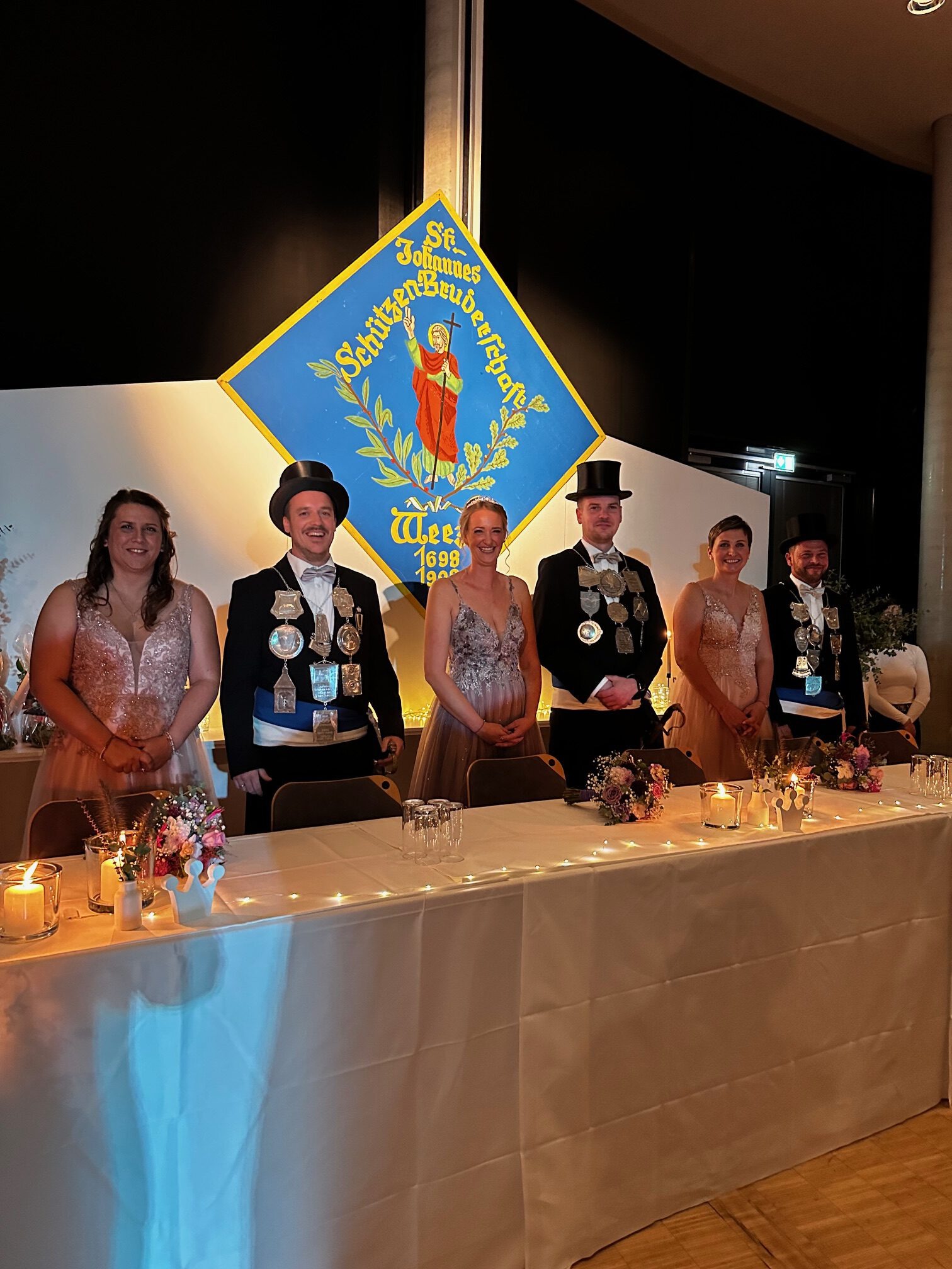 Die St. Johannes-Schützenbruderschaft 1698 Weeze e. V. konnte auch in diesem Jahr wieder einen stimmungsvollen und harmonischen Königsgalaball feiern. Der Saal im Bürgerhaus Weeze war durch den Thron und weitere unterstützende Helfer festlich dekoriert worden, sodass pünktlich um 19:30 Uhr der Ball beginnen konnte. Zahlreiche Schützenbrüder mit ihren Damen sowie die geladenen Gäste erhoben sich von ihren Plätzen zum Einzug der Majestäten. In seiner Eröffnungsansprache begrüßte der Vorsitzende Wilfried Engbroks herzlich alle Anwesenden im voll besetzten Saal und ganz besonders den amtierenden Thron, König Mathias Hermens mit seiner Königin Kristina, an ihrer Seite die Ministerpaare Dennis Kersten mit seiner Frau Julia und Stephan Gorthmanns mit seiner Frau Sarah.